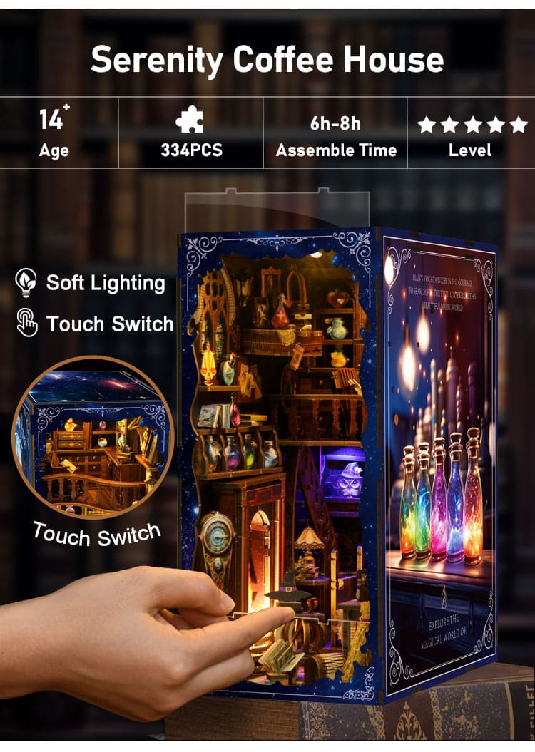 Because it adopts precision laser-cut wooden parts and transparent potion bottle accessories, the finished product presents a vivid potion laboratory effect, making your bookshelf look like it has opened a doorway to a fantasy world.