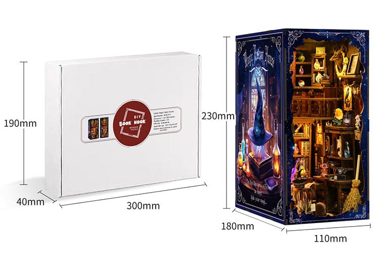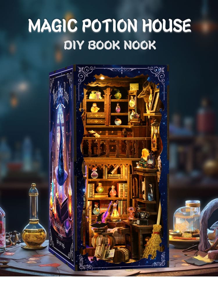 The Magic Potion DIY Book Nook is a fantasy-themed miniature book nook kit designed for craft lovers and book enthusiasts. Inspired by a magical potion laboratory, it combines eco-friendly wood, transparent acrylic accessories, and warm LED lighting to create an enchanting scene between your books. During assembly, you can enjoy the joy of DIY crafting, and once completed, you’ll own a unique DIY Book Nook that adds charm and mystery to your bookshelf.