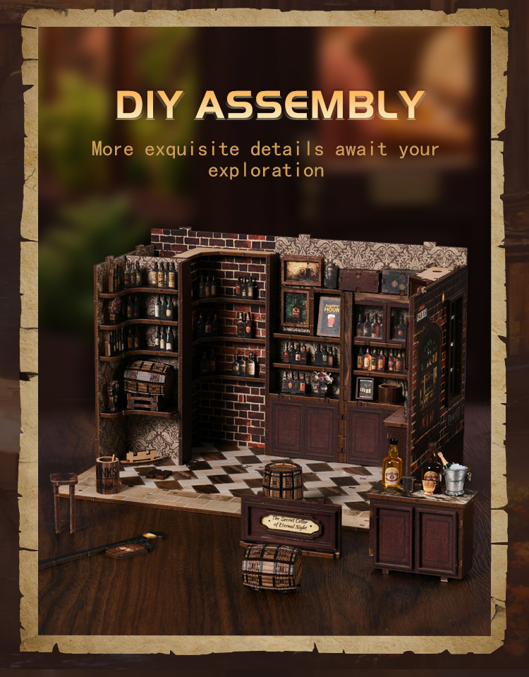 The wine cabinet is filled with miniature wine bottles, each telling its own story. The bar counter setup is detailed and lifelike, letting you immerse yourself in the atmosphere of a true neighborhood pub.