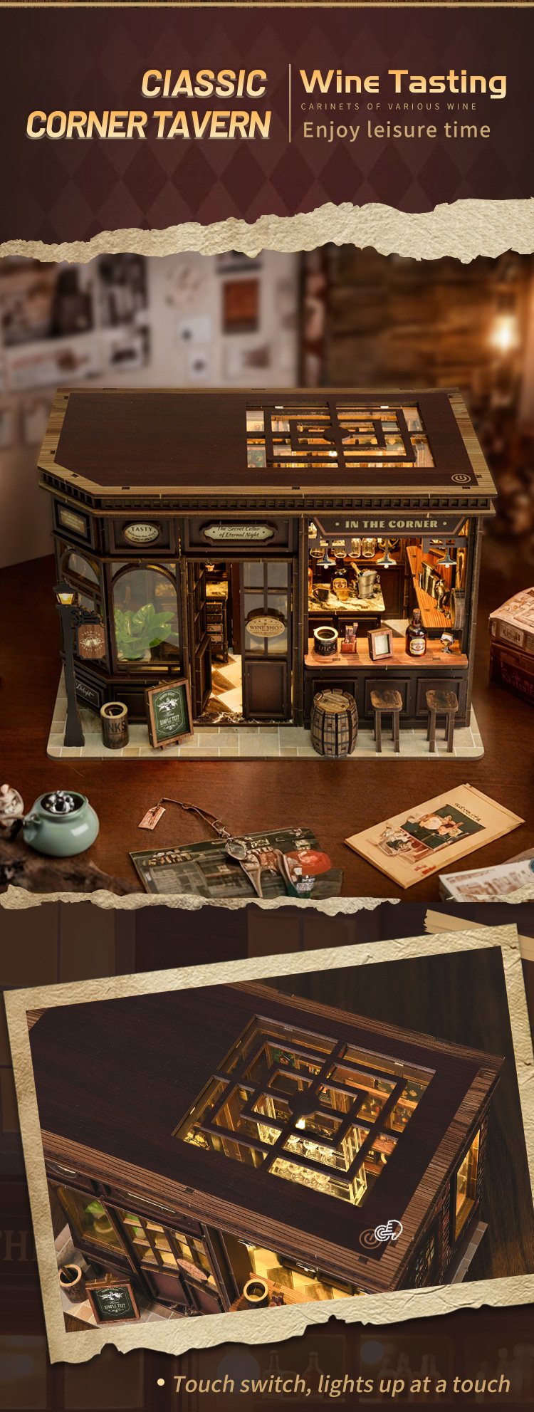 The entire model becomes a functional AMBIENT NIGHT LIGHT. Simply tap the touch switch to make the tavern glow with warm, cozy light — perfect for night-time ambiance.