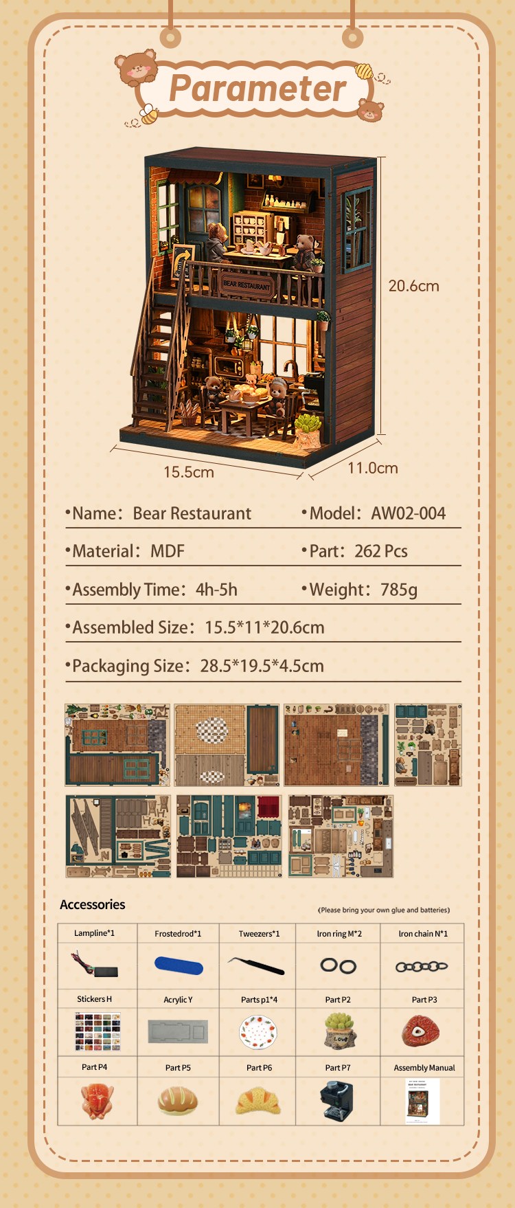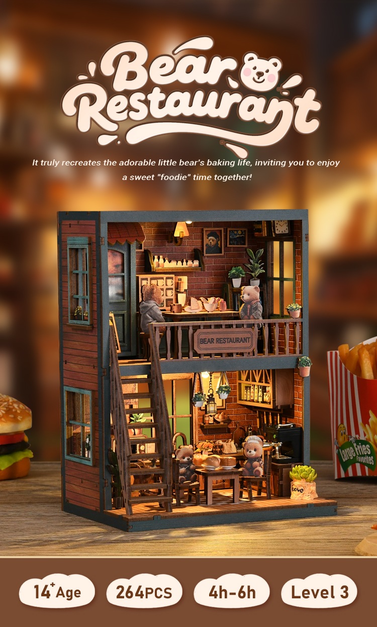 Step into a world of warm baking moments with the DIY Mini House Bear Restaurant. This adorable kit recreates a two-story miniature bakery and café, where the upstairs is a cozy coffee corner and the downstairs is a busy bread workshop. Featuring Mortise and tenon assembly for a snug, glue-free fit, this set lets you enjoy an immersive building experience. From golden fresh bread to mini coffee cups, every detail brings this cute room miniature dollhouse to life.