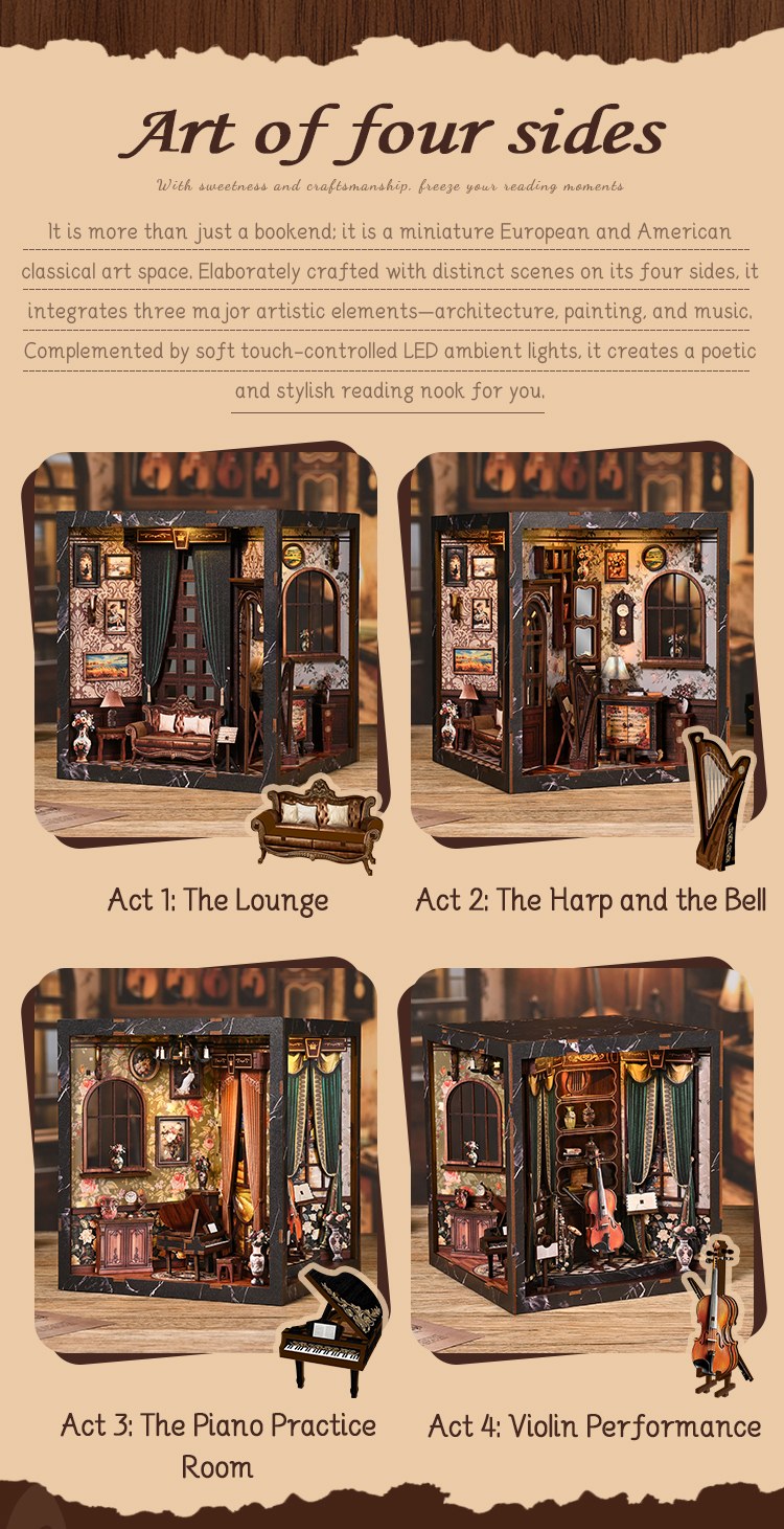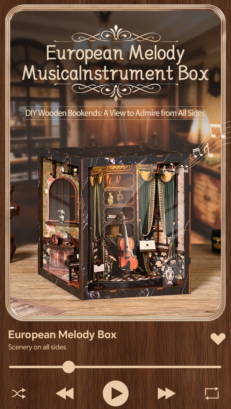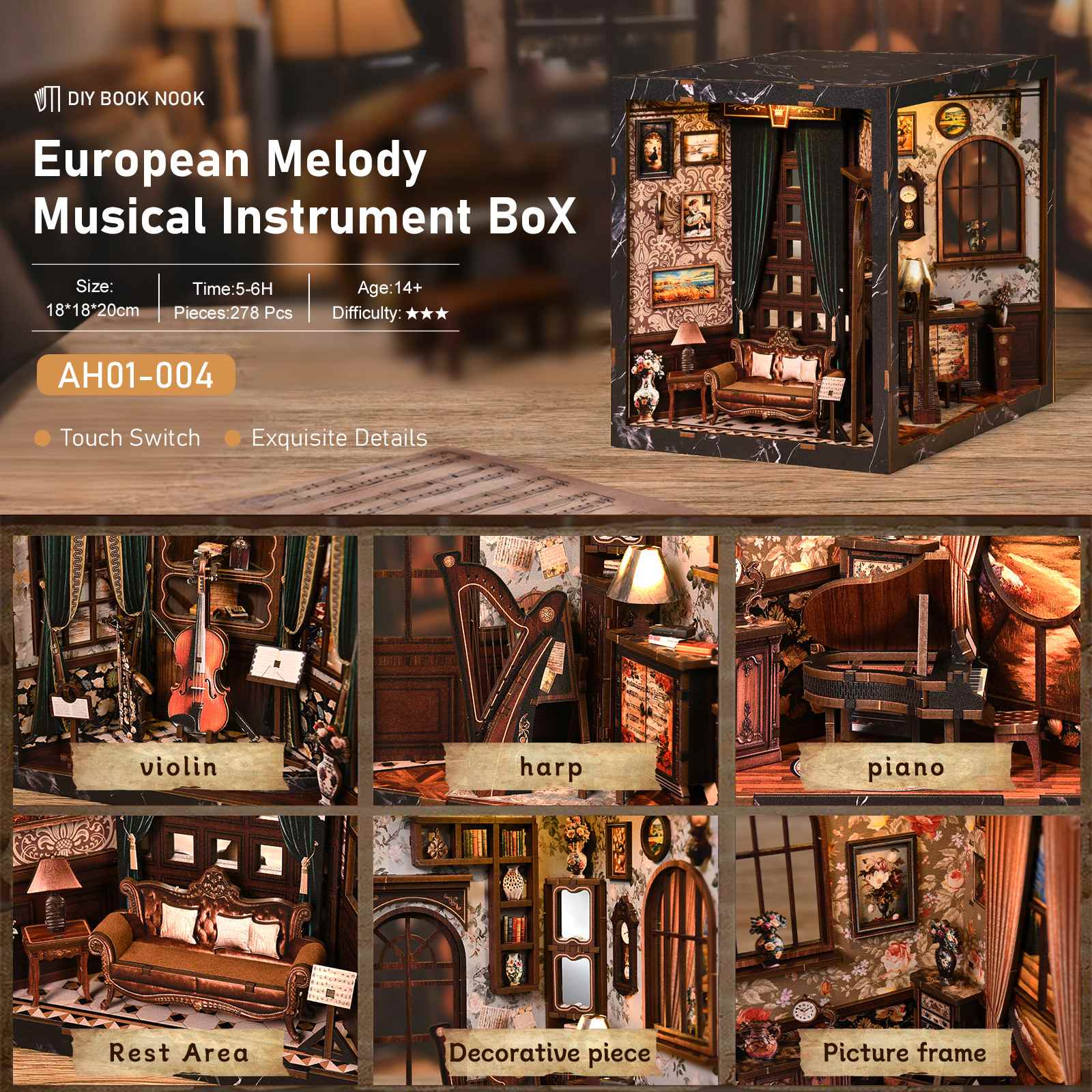 The European Music Box DIY Doll House (Model: AH01-004) is a beautifully crafted miniature European and American classical art space that brings elegance and creativity to your home. With detailed scenes on all four sides, it integrates architecture, painting, and music into a single masterpiece. This diy wooden dollhouse features touch-controlled LED ambient lights, providing a poetic and stylish reading or display nook. Each side depicts a unique scene: