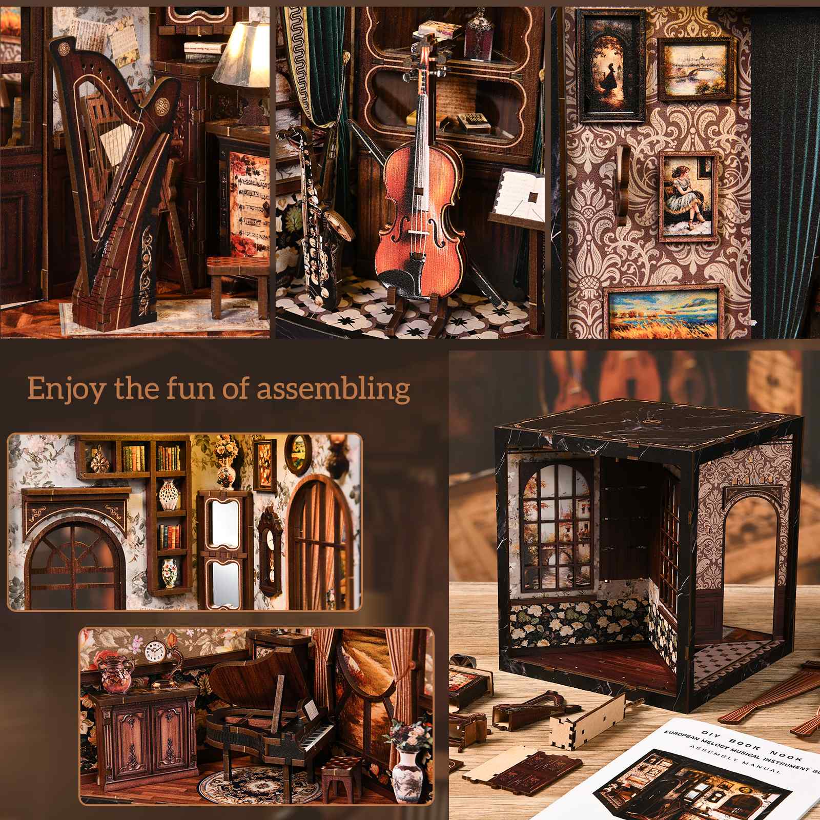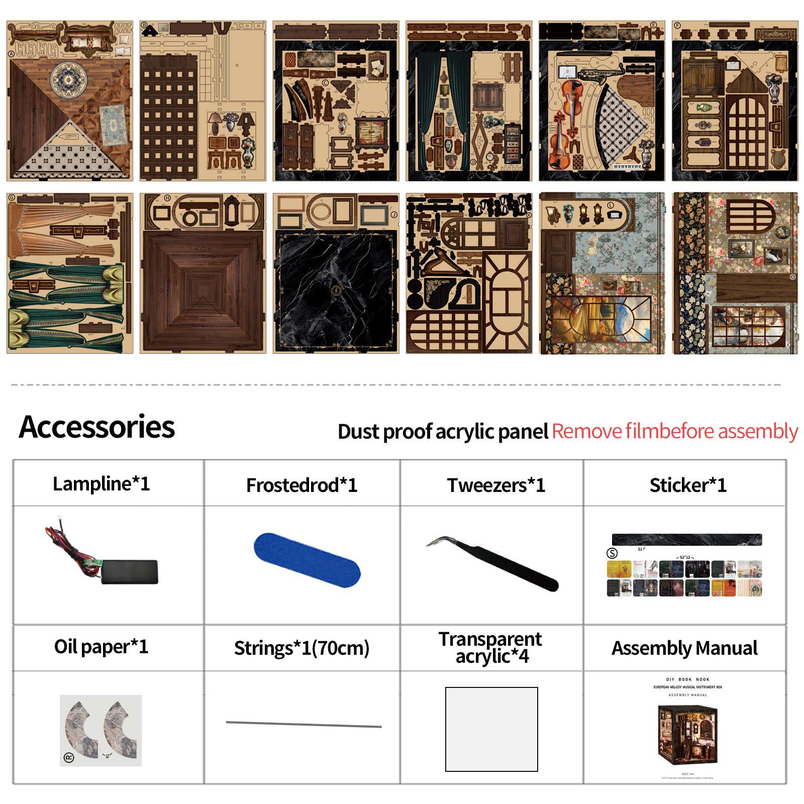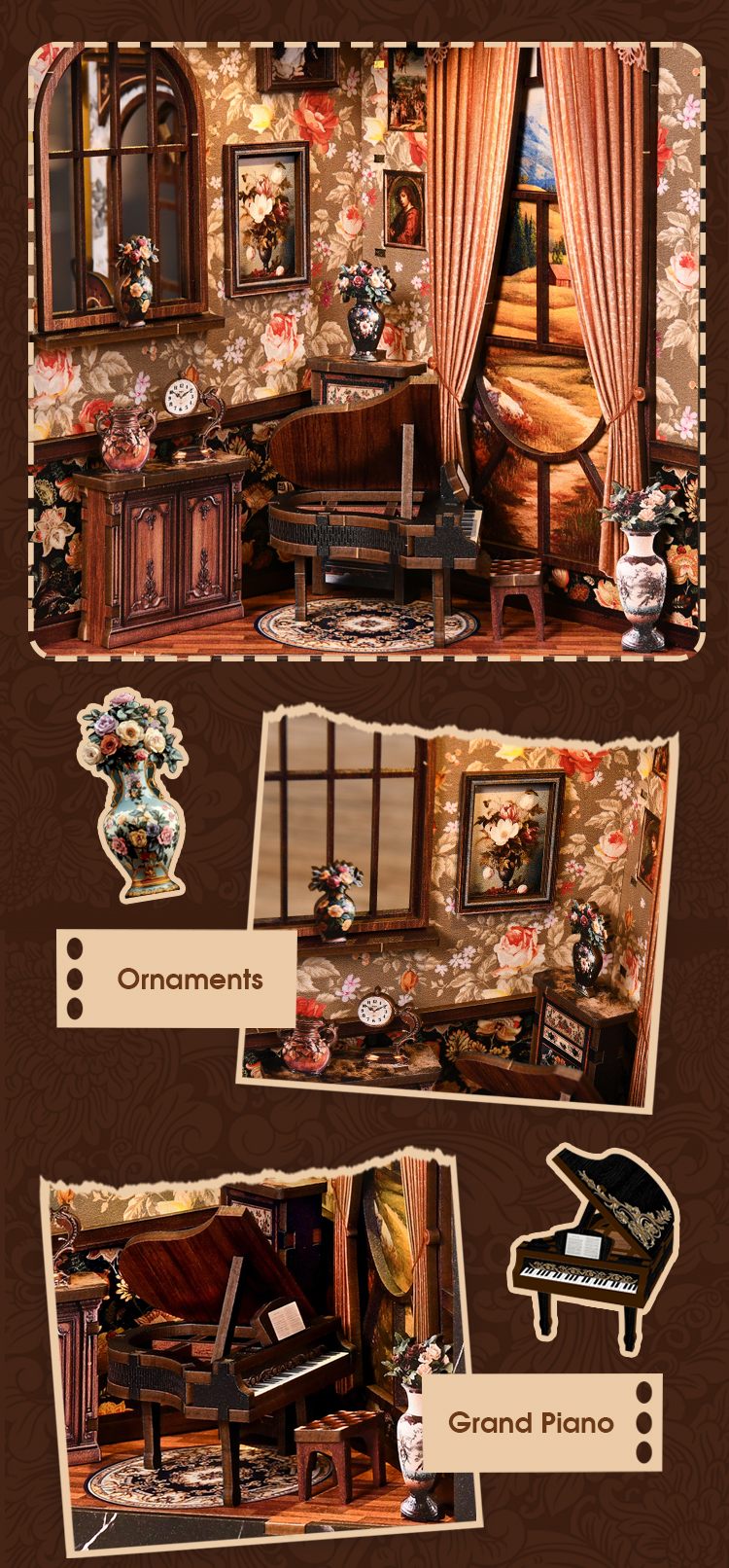 The European Music Box DIY Doll House (Model: AH01-004) is a beautifully crafted miniature European and American classical art space that brings elegance and creativity to your home. With detailed scenes on all four sides, it integrates architecture, painting, and music into a single masterpiece. This diy wooden dollhouse features touch-controlled LED ambient lights, providing a poetic and stylish reading or display nook. Each side depicts a unique scene: