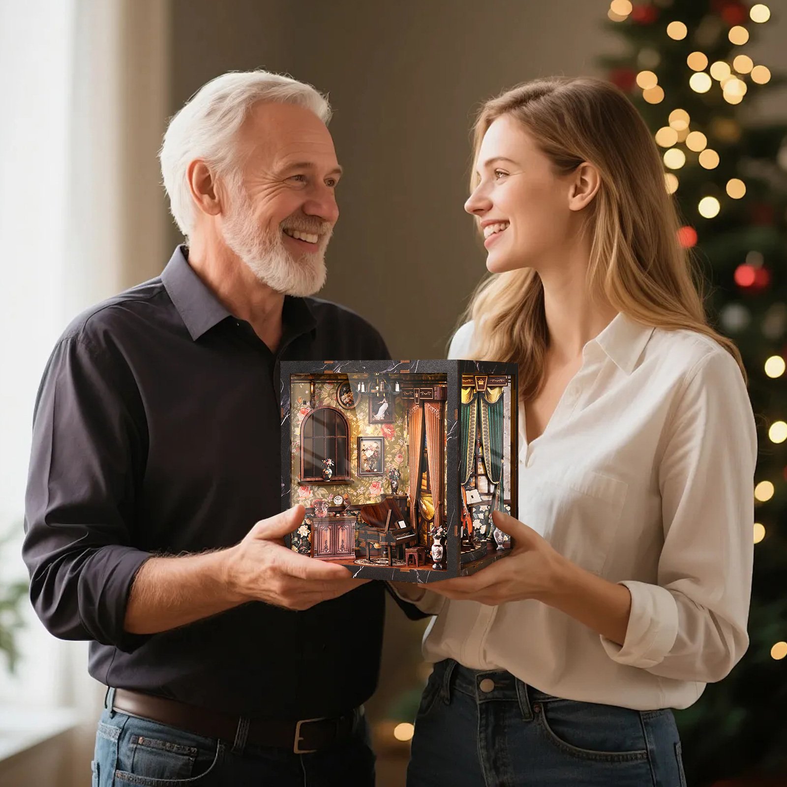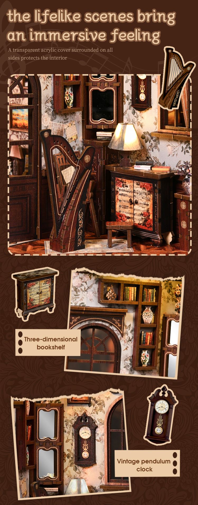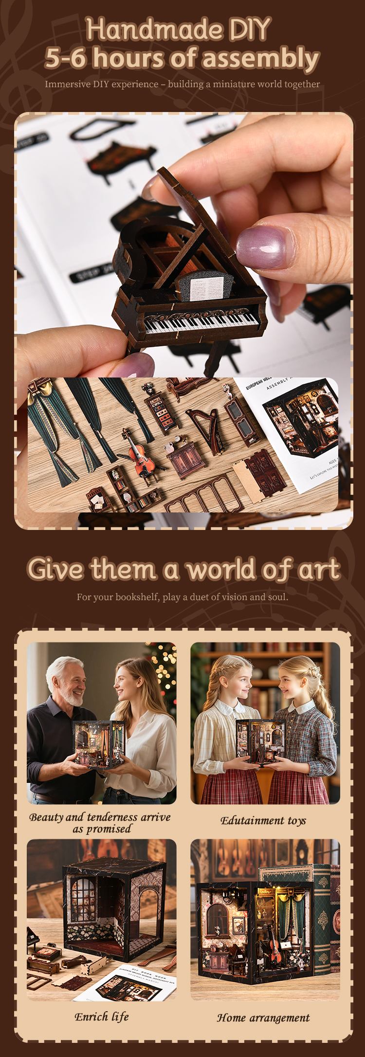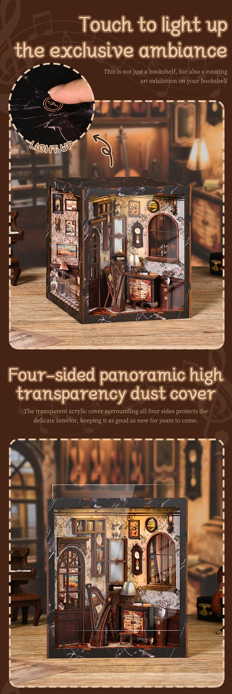 The transparent acrylic cover protects the delicate interior, ensuring the homemade dollhouse stays pristine for years. This rotating mini art exhibition on your bookshelf allows you to enjoy music, art, and craftsmanship simultaneously.