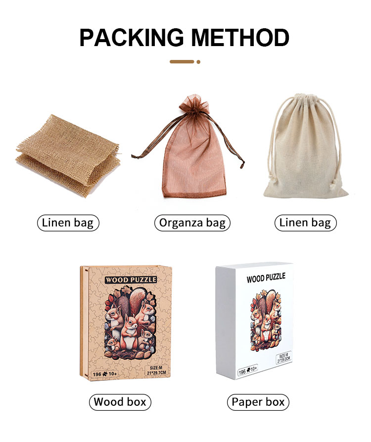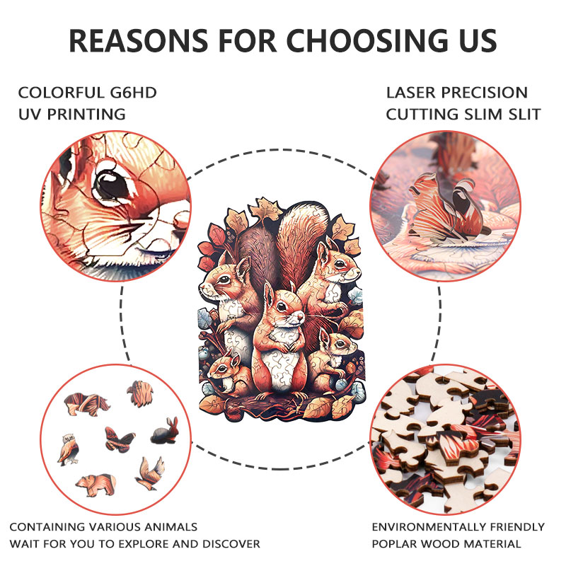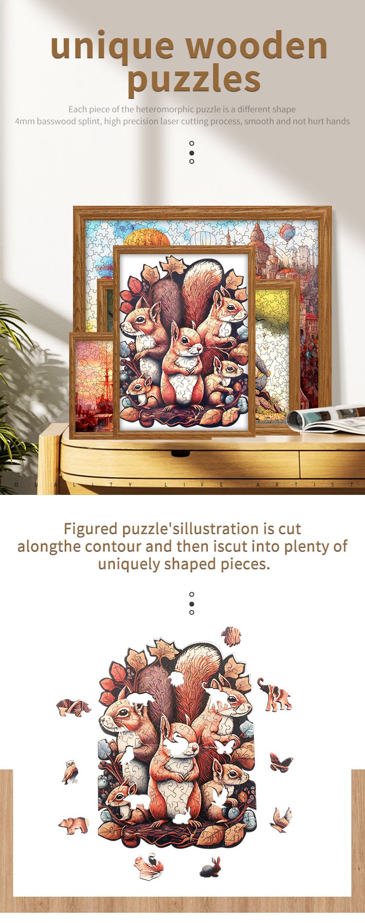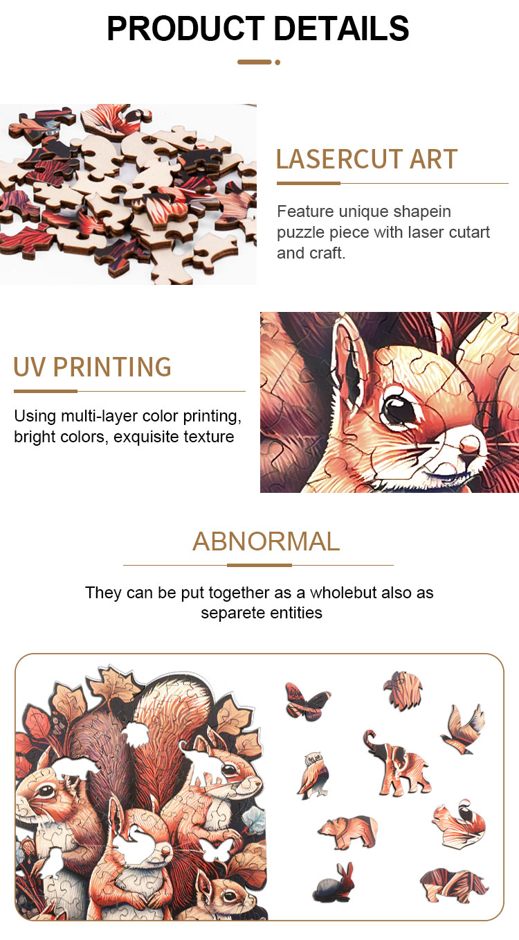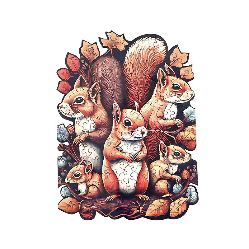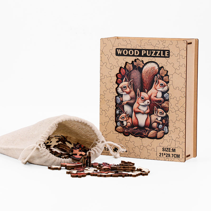 Bring the charm of nature into your hands with our Squirrel Wooden Puzzle, a beautifully designed squirrel jigsaw puzzle made from eco-friendly Poplar plywood. Using high-precision laser cutting, each piece is carefully crafted to form graceful squirrel shapes. Multi-layer color UV printing adds bright, vivid colors and exquisite texture, making this wooden squirrel puzzle not only a fun challenge but also a stunning decorative piece. Perfect for children, adults, and puzzle enthusiasts, these puzzles can be assembled as a complete image or as separate entities, providing hours of engaging fun.