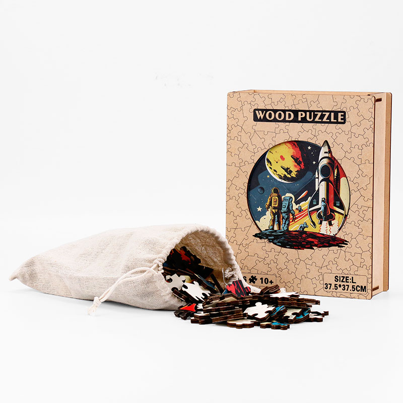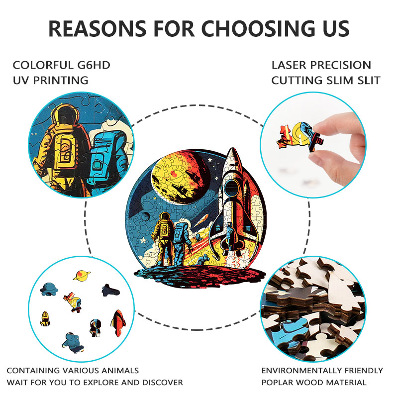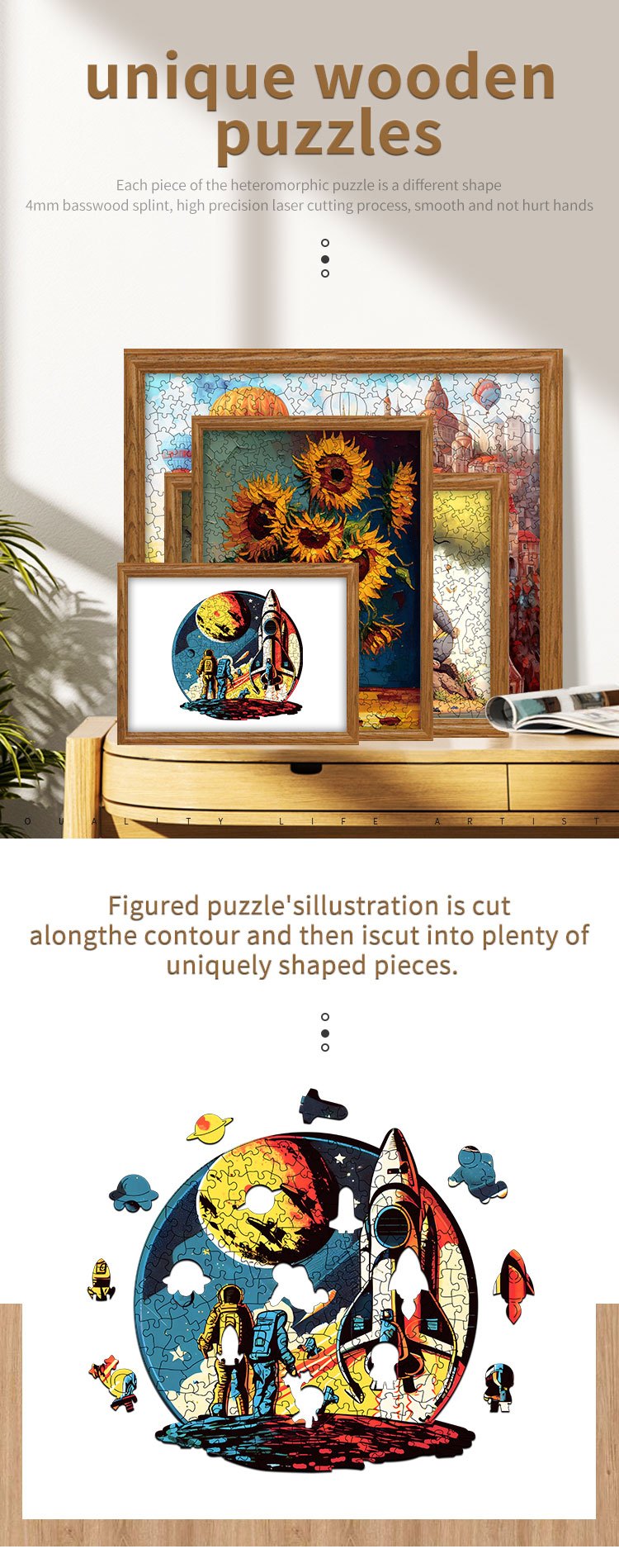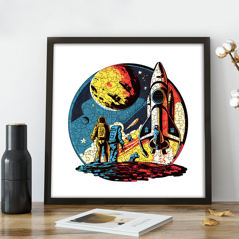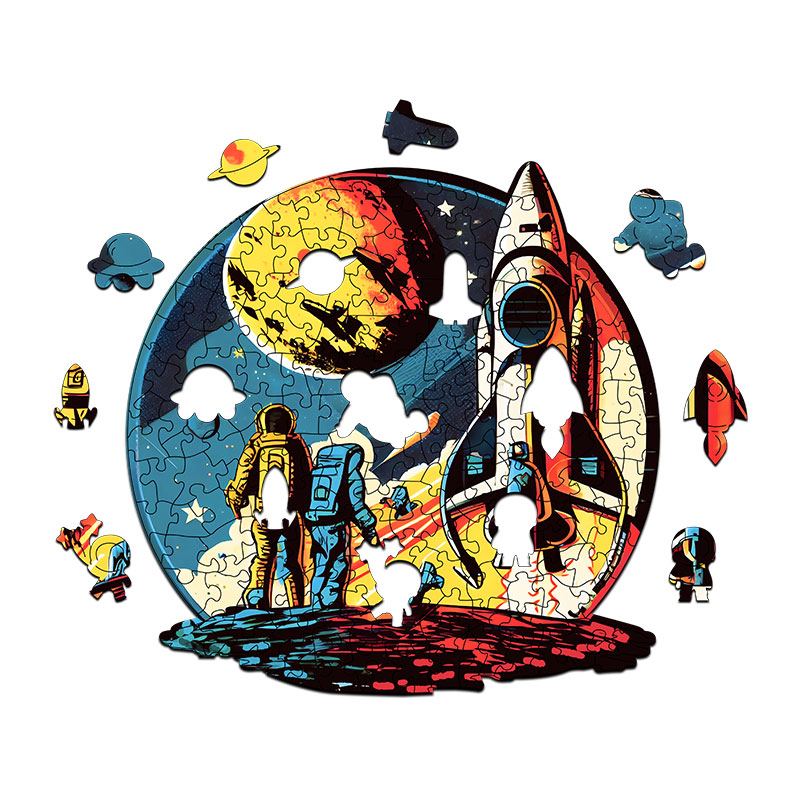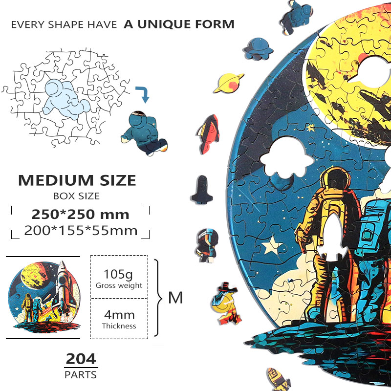 • Unique Shape Puzzle Pieces: Each piece is a complete artistic silhouette (astronaut, planet, spacecraft, etc.).