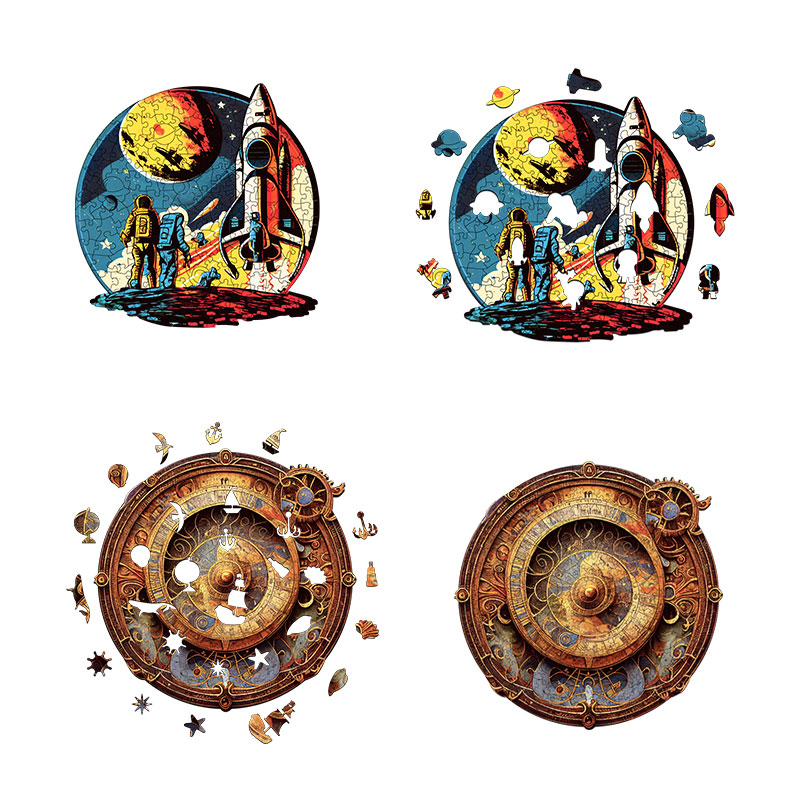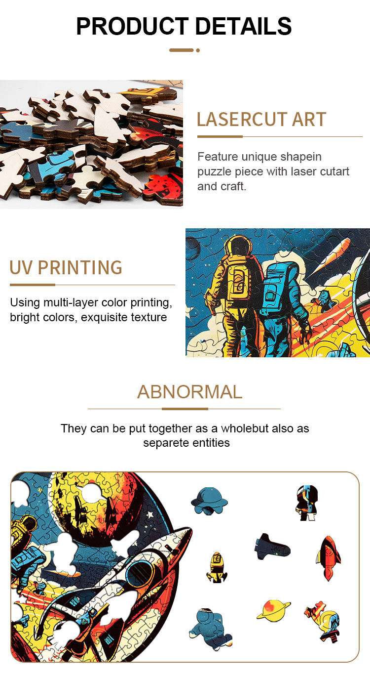 Each piece in the Starry Sky Wooden Puzzle is made from 4mm thick basswood (poplar plywood) and is crafted using a high-precision laser cutting process. This ensures that every edge is smooth, seamless, and comfortable to handle. Instead of traditional jigsaw shapes, each puzzle piece is a recognizable silhouette: astronauts, planets, rocket ships, aircraft carriers in space, cosmic creatures, and more.