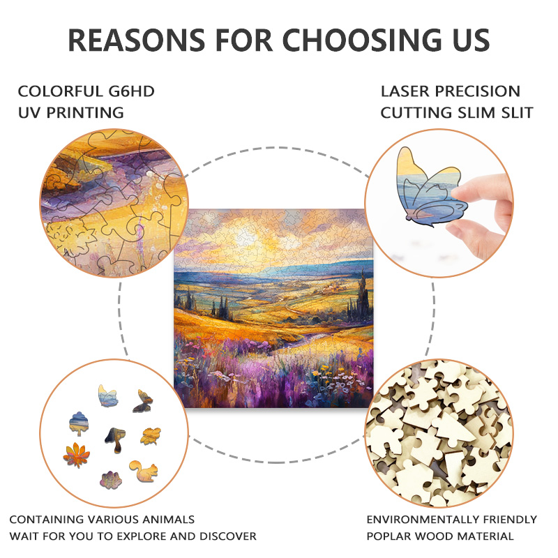 The puzzle uses advanced G6HD UV multi-layer printing technology, giving each piece delicate color layers and realistic textures. With high color saturation and excellent wear resistance, the finished puzzle forms a stunning sunset scene. It is not only enjoyable to assemble but also serves as a unique decorative piece for your desk or living room.