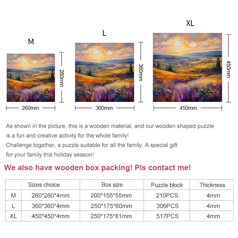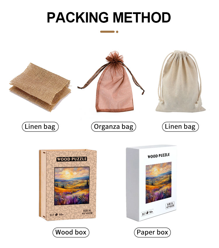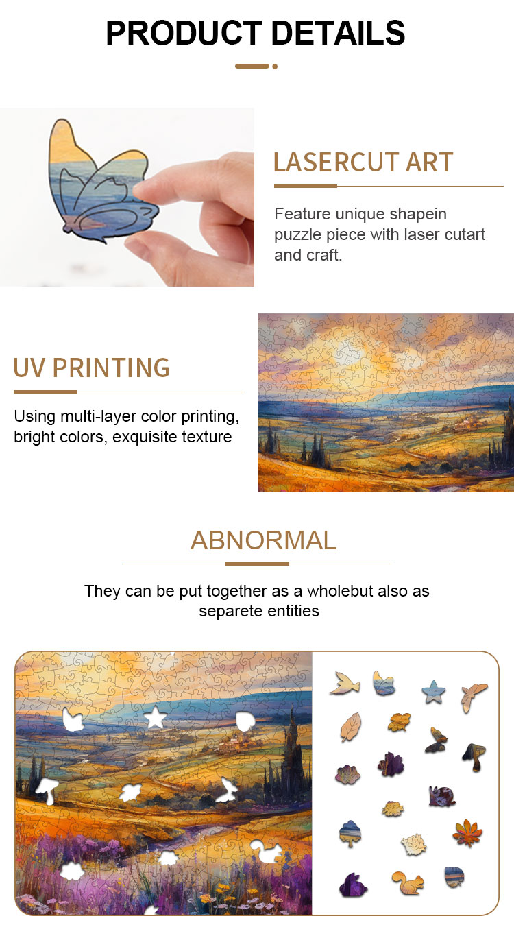 The Sunset Jigsaw Puzzle is a beautifully crafted wooden puzzle designed to capture the enchanting colors and tranquility of a sunset. Each piece is precision-cut from 4mm thick poplar plywood using high-precision laser technology and features multi-layer UV printing for vibrant, long-lasting colors. This puzzle combines creativity, artistry, and relaxation, offering both a fun hands-on activity and a unique decorative piece for your home. With uniquely shaped pieces that can form a complete scene or stand alone as miniature figures, this sunset puzzle transforms traditional puzzle-solving into an artistic and immersive experience.