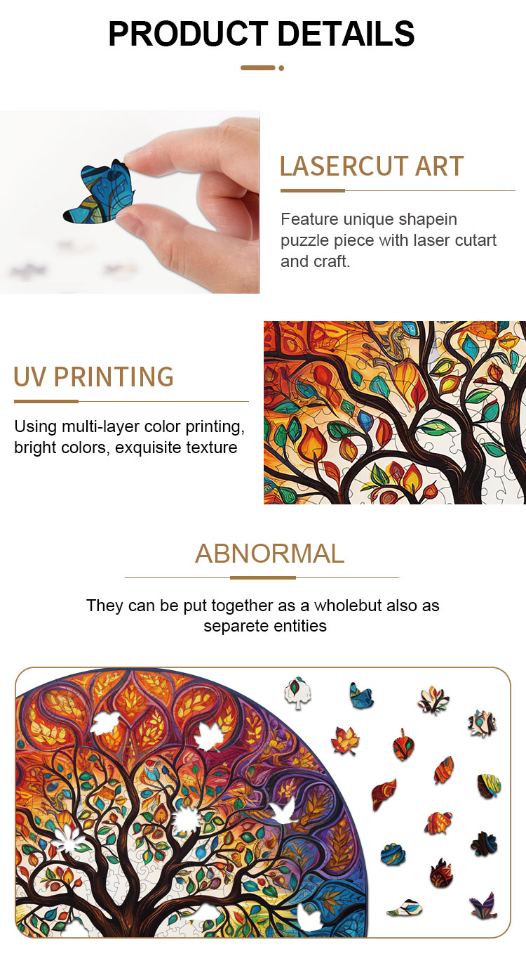 Experience the magic of creativity and craftsmanship with our Tree of Life Jigsaw Puzzle, a beautifully designed set of wooden jigsaw pieces that blends art and fun. Each piece is crafted using high-precision laser cutting technology to create unique shapes, while UV printing delivers vibrant, multi-layer colors and exquisite textures. This puzzle is more than a game—it’s a creative journey, allowing you to assemble the pieces as a whole or explore each element as a separate entity. Perfect for puzzle enthusiasts, family bonding, or as a thoughtful custom puzzle gift.